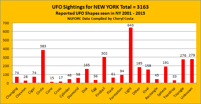 If you want to see a chart of the various types of UFO configurations, there are plenty of sighting charts on the Internet; simply Google: “UFO shapes.” In the spirit of the UFO shapes discussion, I’ve decided to share a summary of the 3,163 UFO shapes reported in the past 15 years from 2001 through 2015.