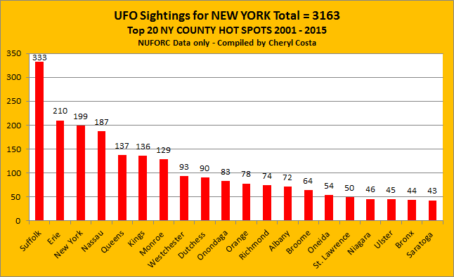 A couple of months ago, I wrote about the unique data I had gathered from analyzing New York’s 62 counties. I neglected to share any charts and for that I received mail requesting charts the next time I report county sighting levels. Below is a list of the top 20 counties in New York for UFO Sightings. This should give at least seven of them bragging rights. Sorry Pine Bush! Orange county came in at 11th place.