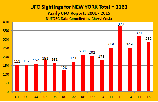 Please note: Since 2008, there has been an upward trend in the state’s sighting reports. I think that 2012 was a statistical fluke for New York. Of the top five states that I’ve analyzed, not everyone has seen a jump in sightings in 2012. That said, I have noted an upward trend for 2014 with both New York and four other top five states.