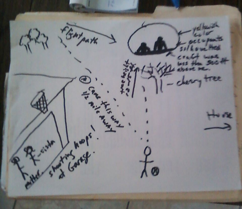 He shot another basket retrieved his ball and while returning to position he glanced back at the bright object. That’s when he realized that this thing wasn’t making any sort of noise; this puzzled him. He kept watching the object as it slowly and silently flew over the tops of the neighborhood’s tall maple trees.