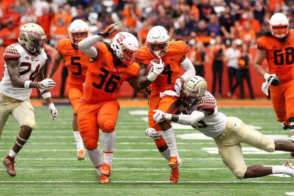 The Syracuse University football team has climbed to a 3-0 season thus far, with an impressive Sept. 15 Carrier Dome victory against Florida State University. The Orange toppled the Seminoles 30-7, and managed to do it without quarterback Eric Dungey, who was sidelined in the second quarter with an eye irritation. SU redshirt freshman QB Tommy DeVito stepped into the breach and quickly went into touchdown mode, which surely delighted Coach Dino Babers. Former Orange player Donovan McNabb was also at the Dome, which was rocking with more than 37,000 fans.