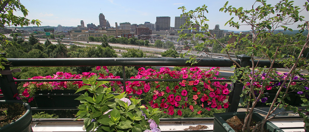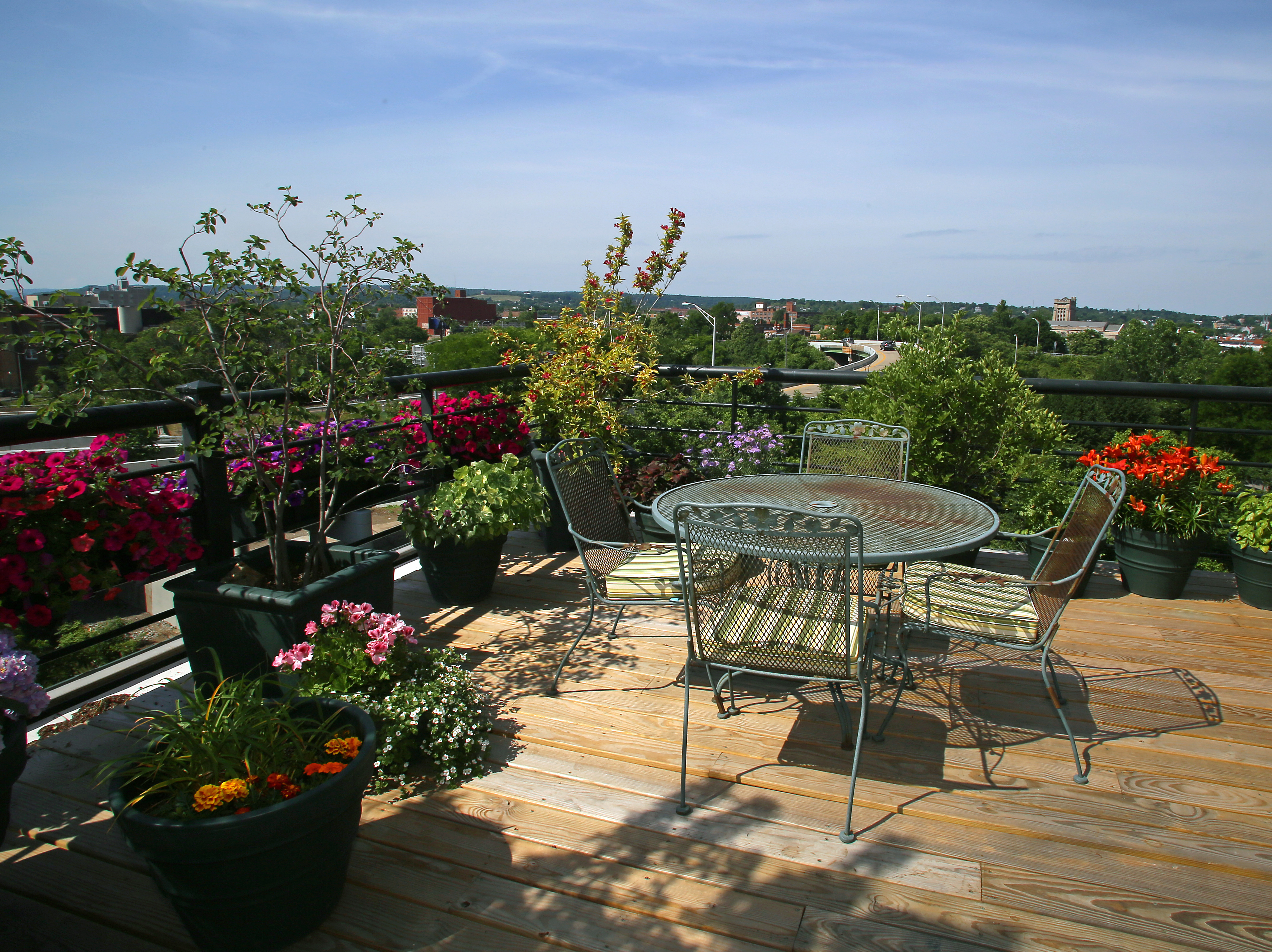 Many drivers along Interstate 690 are familiar with the window boxes of pink and purple petunias on the roof-top garden on Franklin Square’s Mission Landing condominiums.