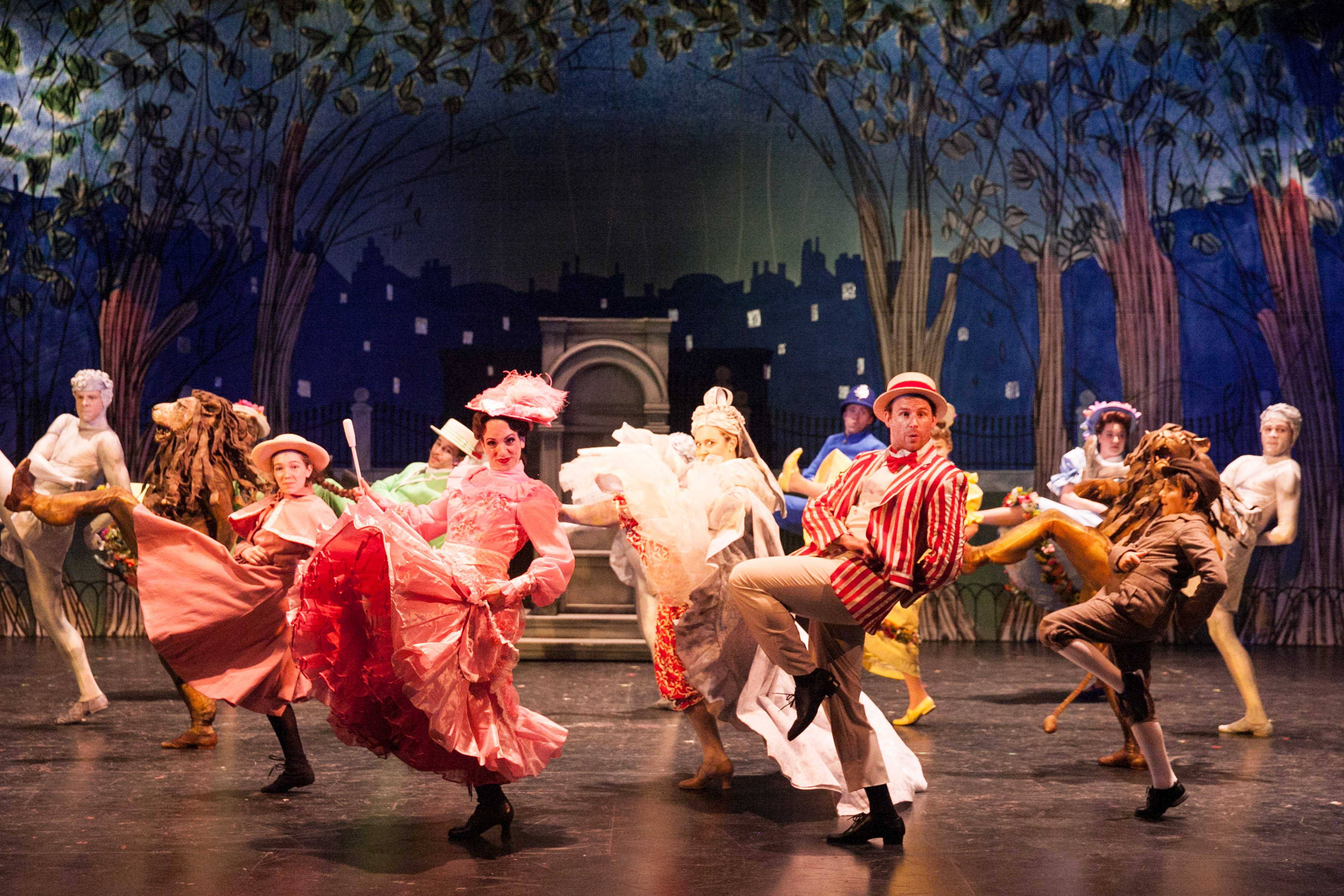 Magical elements from the 1964 film that can only be accomplished with a camera have been deleted, and replaced with miracles of stagecraft. China cabinets collapse and rise from the dust. Inconvenient characters disappear in flames. And marble statues in the park come alive and join in the chorus.