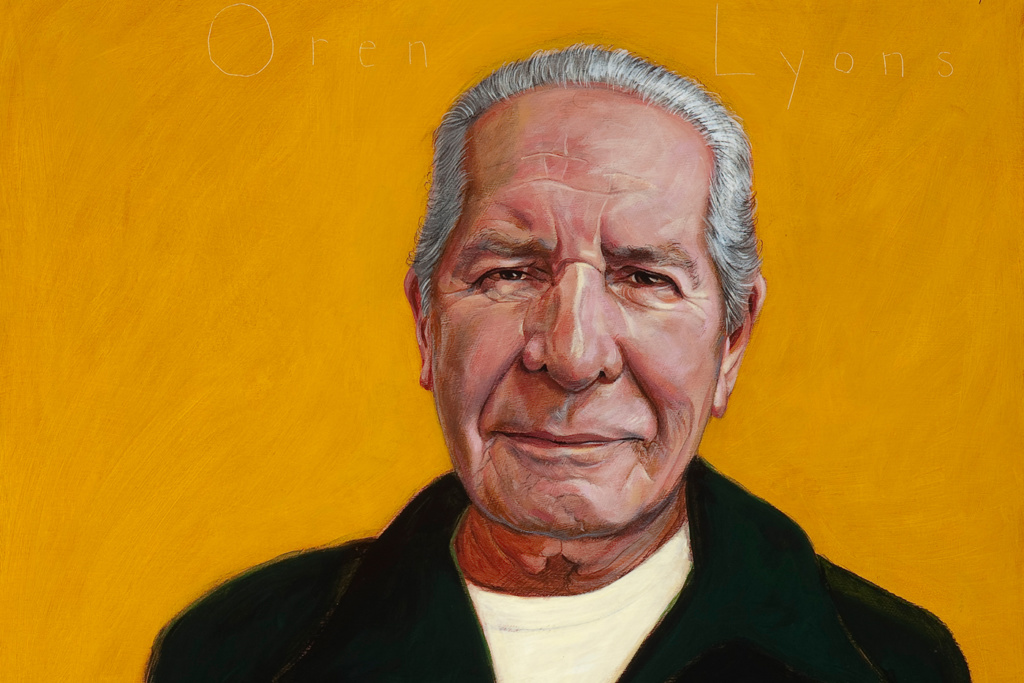 The exhibition also has ties to Central New York, as seen in several portraits. Phillip Berrigan was born in Syracuse and later spent many years protesting against nuclear weapons and economic inequality. Shetterly also created a portrait of Mara Sapon-Shevin, a writer, professor at Syracuse University, and advocate for the principle of inclusive education. A third portrait depicts Oren Lyons, faithkeeper for the Onondaga Nation, and recognized internationally for speaking out for the rights of indigenous peoples and on climate change.