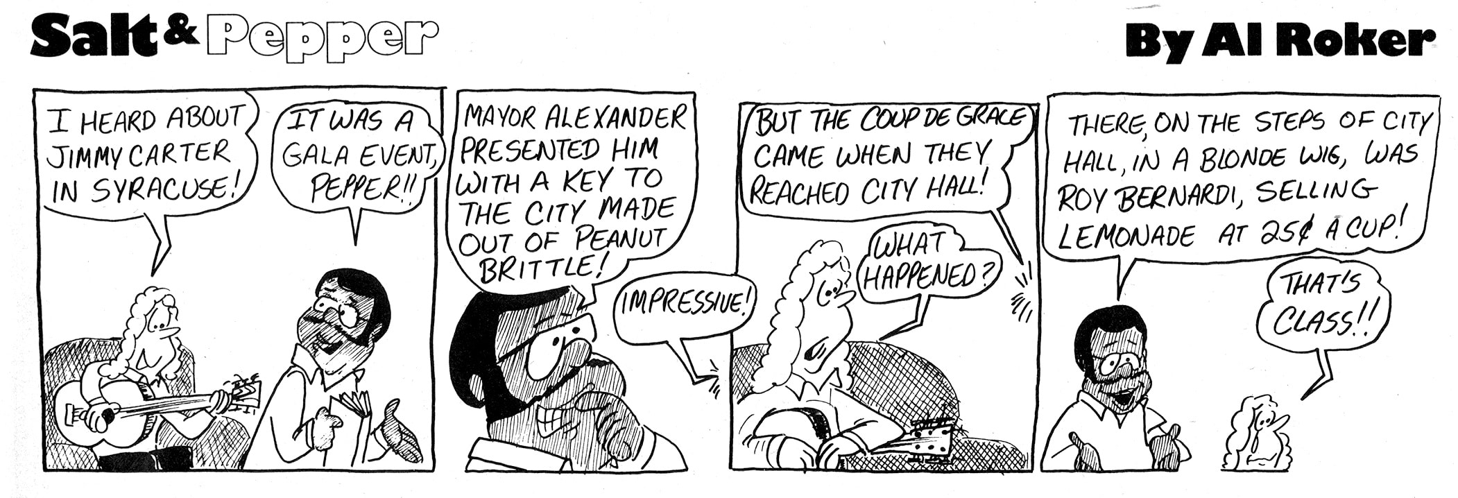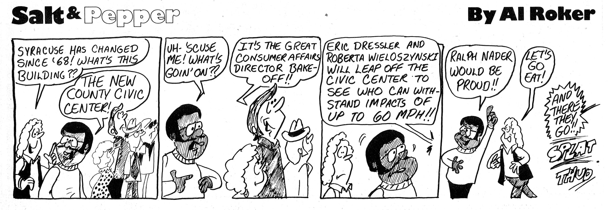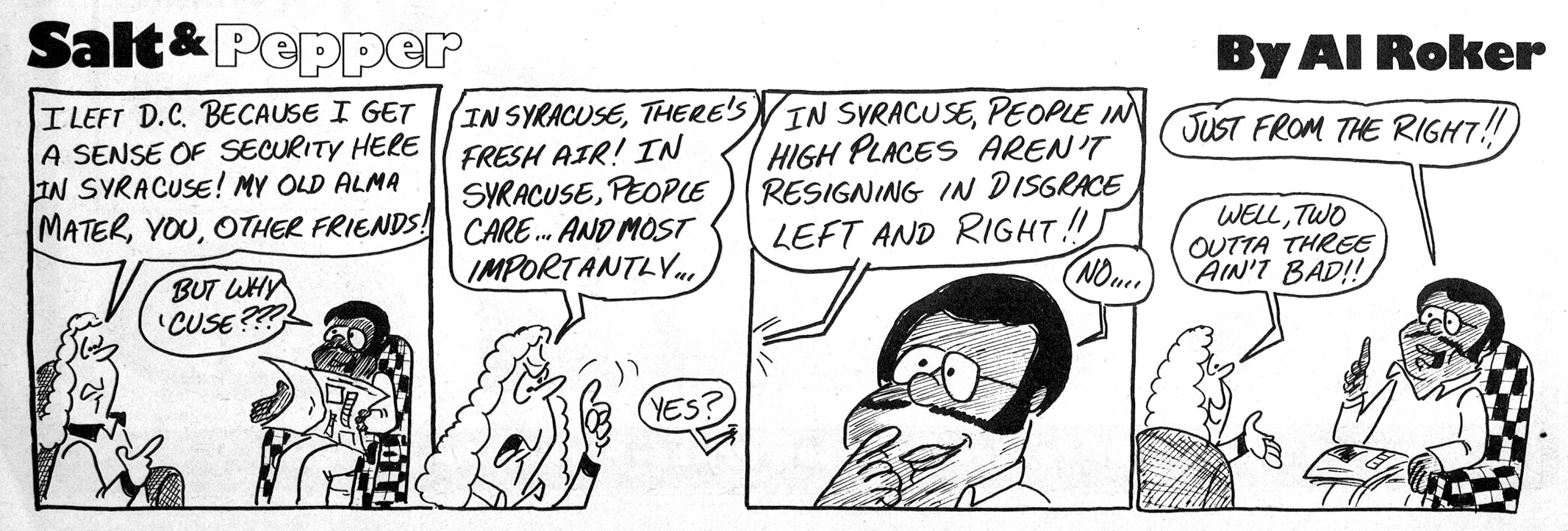 Now safely ensconced as the third wheel to co-anchors Savannah Guthrie and Hoda Kotb on NBC-TV’s The Today Show, there was a time when Al Roker hailed from our neck of the woods, back during the early 1970s when he was attending school at SUNY Oswego and as a weather forecaster on WTVH-Channel 5. And for a very short time, Roker also put pen to paper as a Syracuse New Times cartoonist for the comic strip “Salt and Pepper,” which debuted in the Oct. 3, 1976, issue.