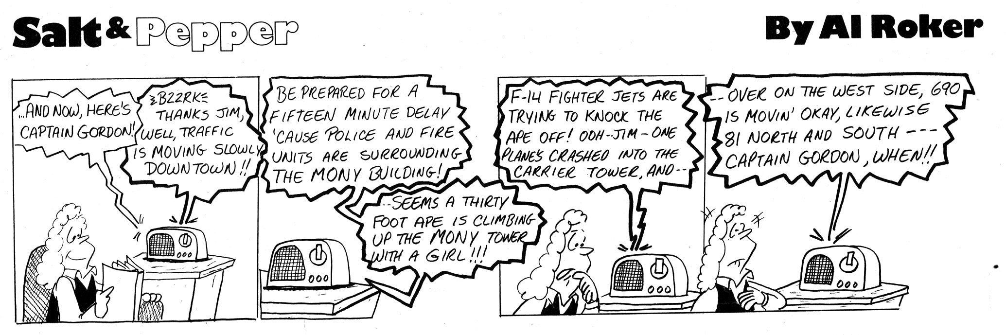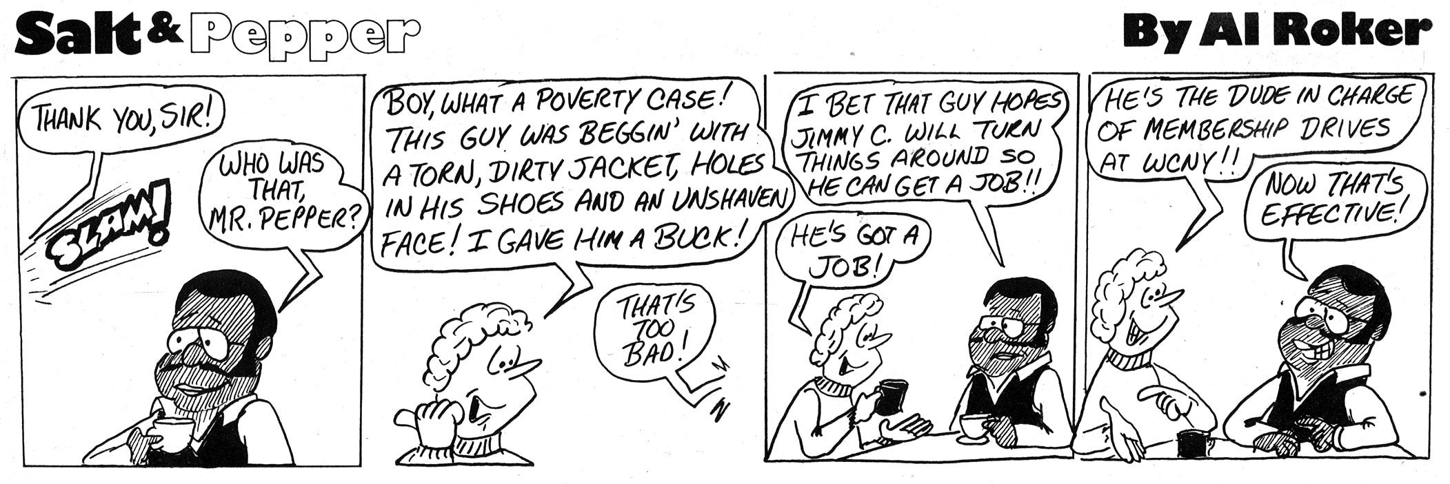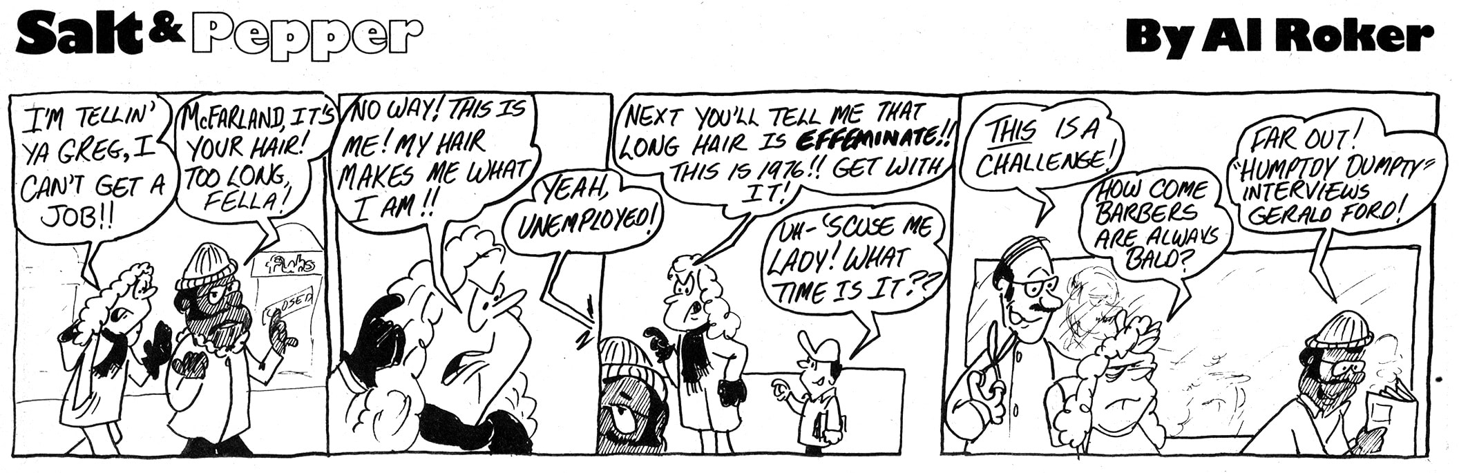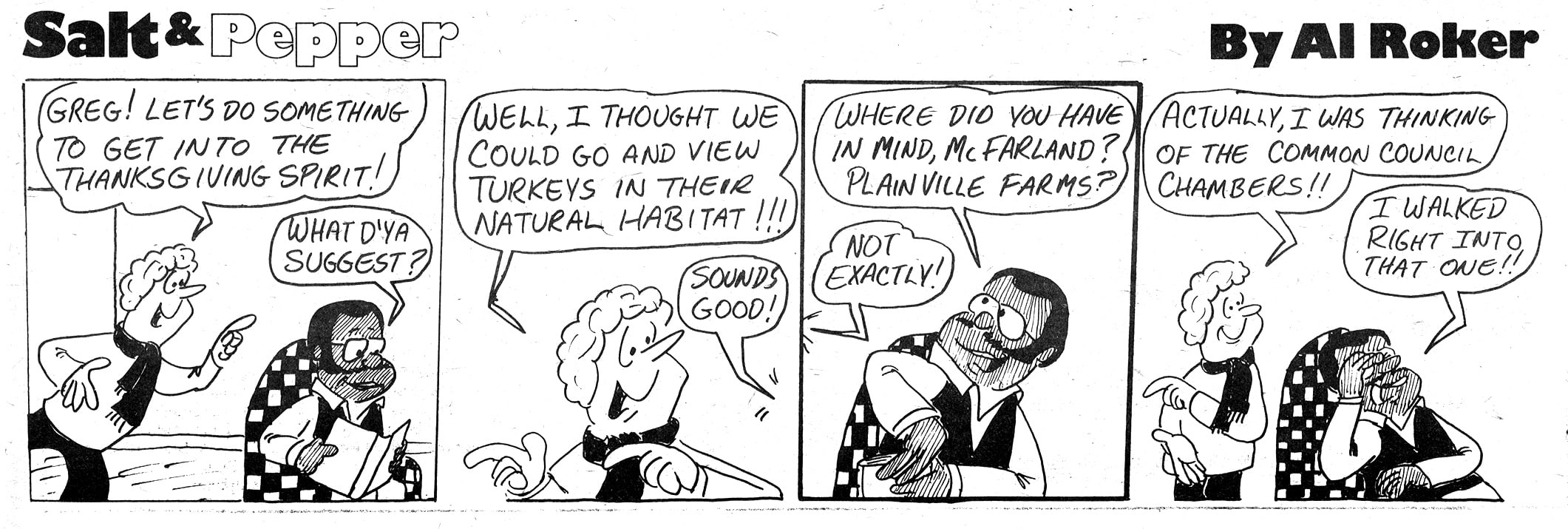 Now safely ensconced as the third wheel to co-anchors Savannah Guthrie and Hoda Kotb on NBC-TV’s The Today Show, there was a time when Al Roker hailed from our neck of the woods, back during the early 1970s when he was attending school at SUNY Oswego and as a weather forecaster on WTVH-Channel 5. And for a very short time, Roker also put pen to paper as a Syracuse New Times cartoonist for the comic strip “Salt and Pepper,” which debuted in the Oct. 3, 1976, issue.
