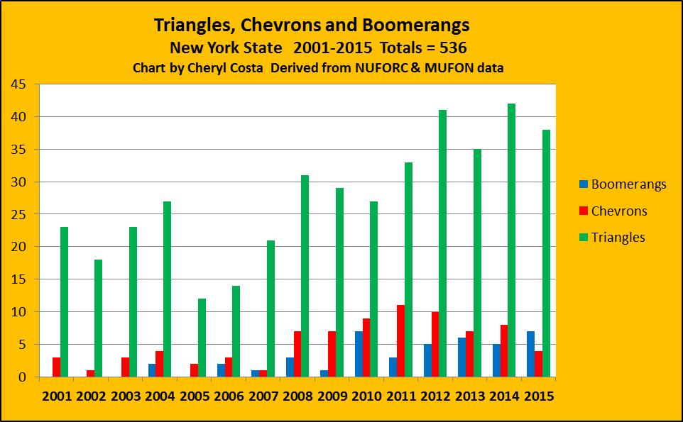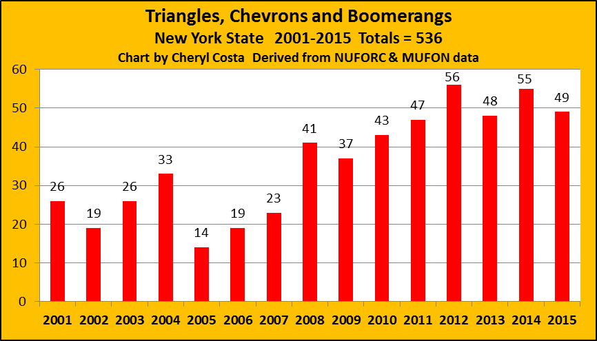 Chevron shaped UFOs in the Empire State tallied 105 for all-time and 80 for the 15 year sample. Seventy-six percent of the chevron UFO sightings in NY occurred during the 15 year sample period.
