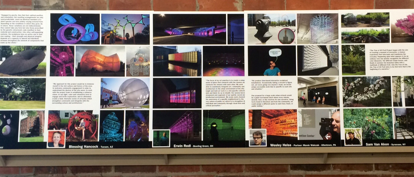 The next step will be inviting the six artists to visit Syracuse to meet with community members as they refine their initial concepts and scope out locations. We think you’ll find them enjoyable. They are all talented professionals, and also dynamic, engaging people who love working with communities.