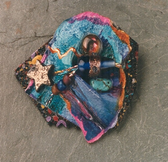 In her jewelry, Sharon Alama works with thick watercolor paper, which she tears, folds, varnishes and embellishes with beads, threads and charms. At Edgewood, she has a variety of earrings and collage pins on display.
