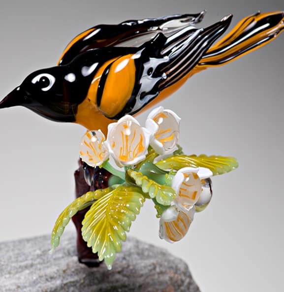Jason Howard has started making birdthemed art glass during the last year. This exhibit presents sculptures depicting a goldfinch, white dove, Baltimore oriole, blue jay, and red-breasted woodpecker, among other birds. The artist is able to communicate not only the woodpecker’s striking colors but also the visual appeal of a one-color dove.