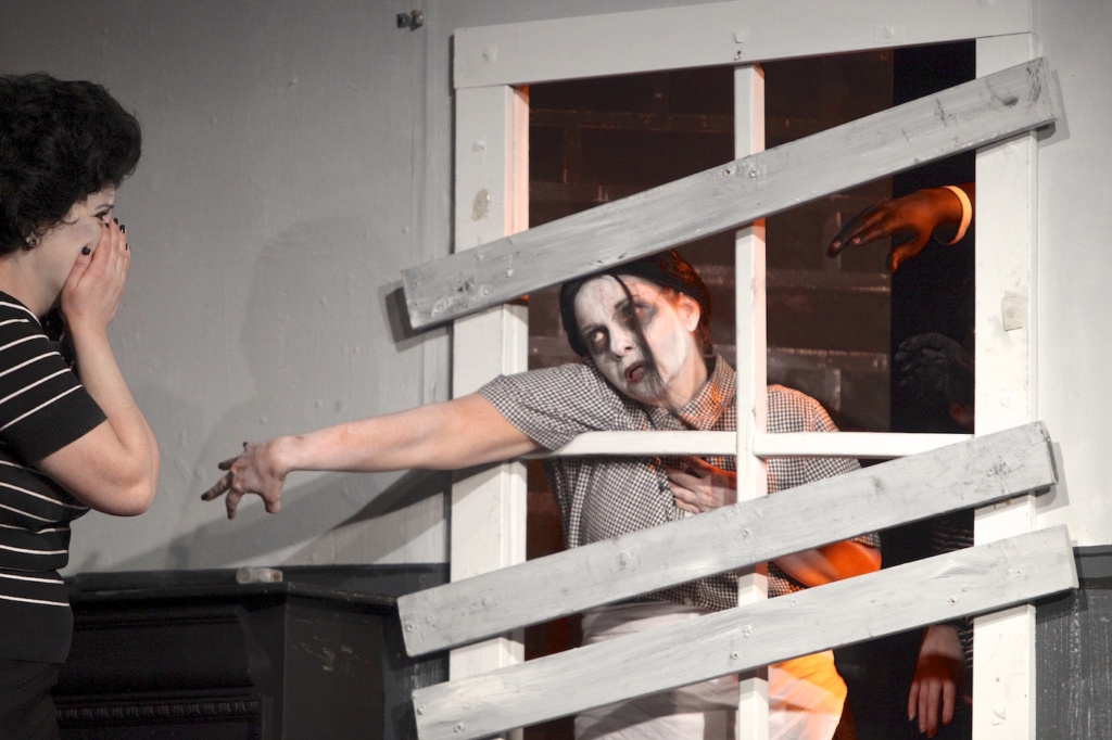 Director and set designer Dan Rowlands is no stranger to the zombie oeuvre, having helmed Evil Dead: The Musical as the 2014 Halloween attraction at the playhouse. Rowlands adheres to the movie’s stark black-and-white visual style, with the cast members’ clothing and the single living room set all dressed in shades of greyscale. Unlike the flesh eaters’ shambling cadence, Rowlands’ show moves at a fast clip, although there are some unavoidable moments when it feels like a radio play.