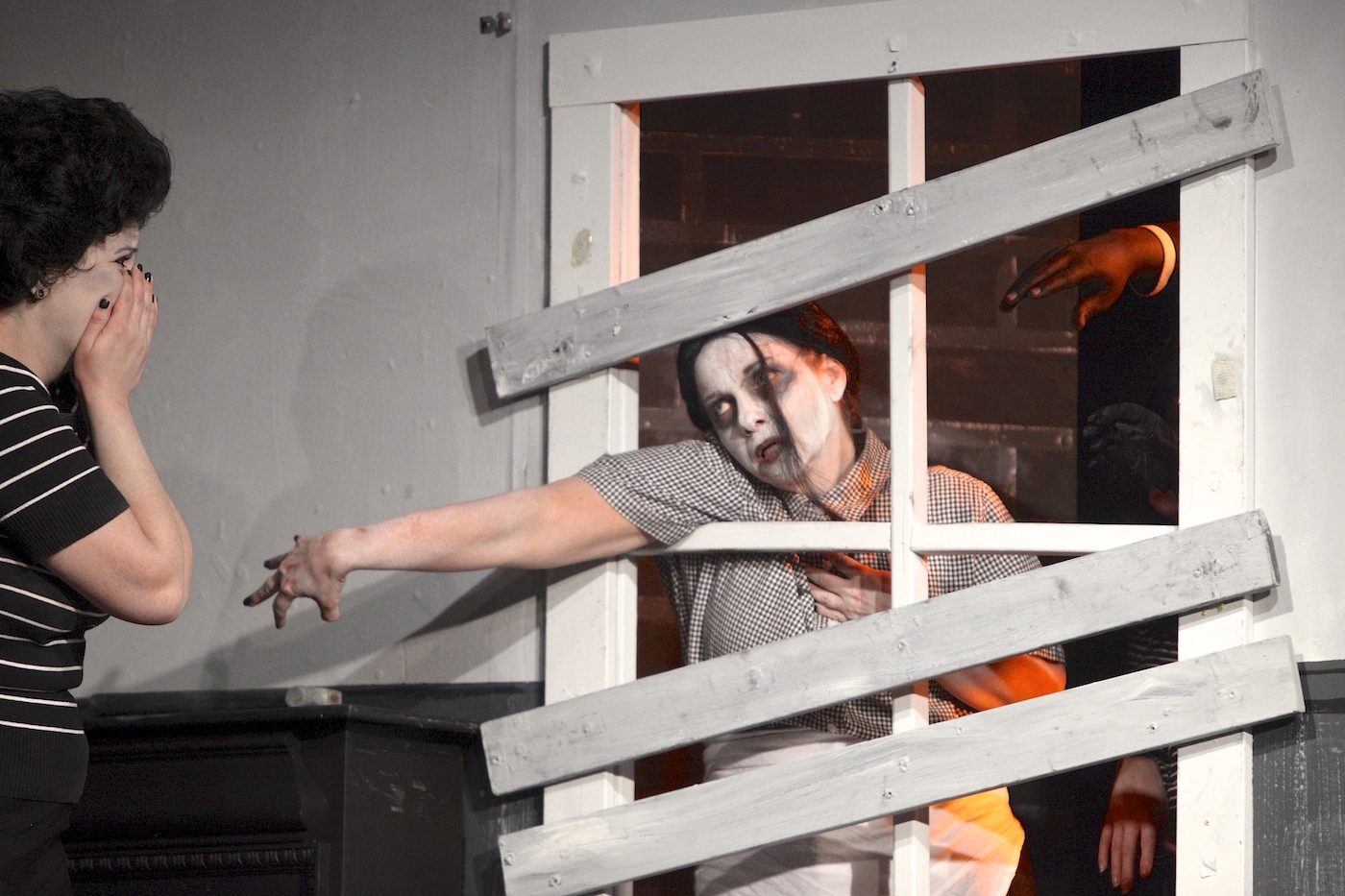 Lori Allen Ohm’s adaptation focuses mostly on the nightlong farmhouse siege, while condensing other elements that could not be transposed to the stage, such as cemetery visitor Barbara (Lynn King) and her escape from the ghouls during the movie’s long opening sequence. Then again, audiences who take in the floorboards version are surely fans of the sick flick, whose public domain status (the movie was never copyrighted) only increased its popularity by becoming more readily available through numerous TV broadcasts and as a VCR perennial.