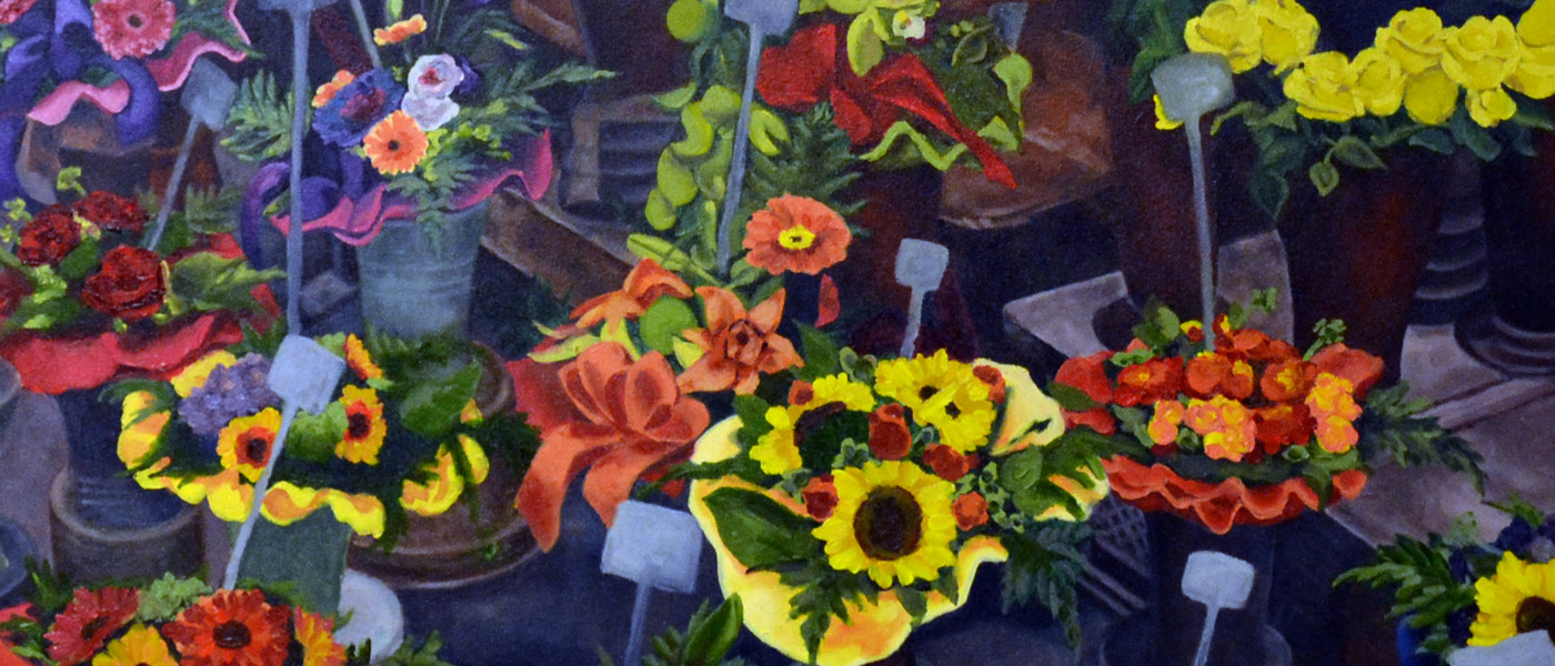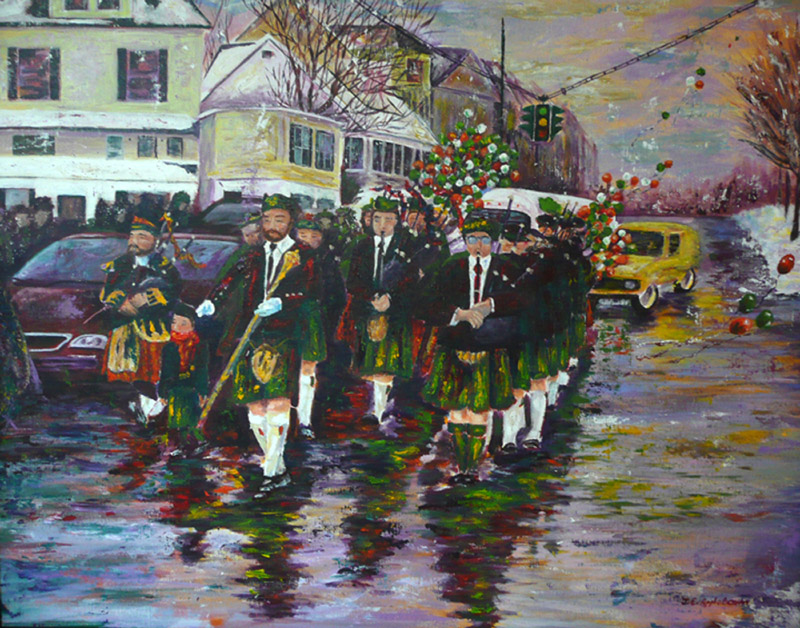 Joan Applebaum‘s acrylic does a nice job of depicting the annual green beer parade held on Tipperary Hill several weeks before St. Patrick’s Day. She integrates adjacent buildings and the parade action, leading a viewer’s eyes from the quilts of pipers playing music to other sights, including green balloons, afternoon shadows resting on pavement and a singular stoplight with the green light on top.
