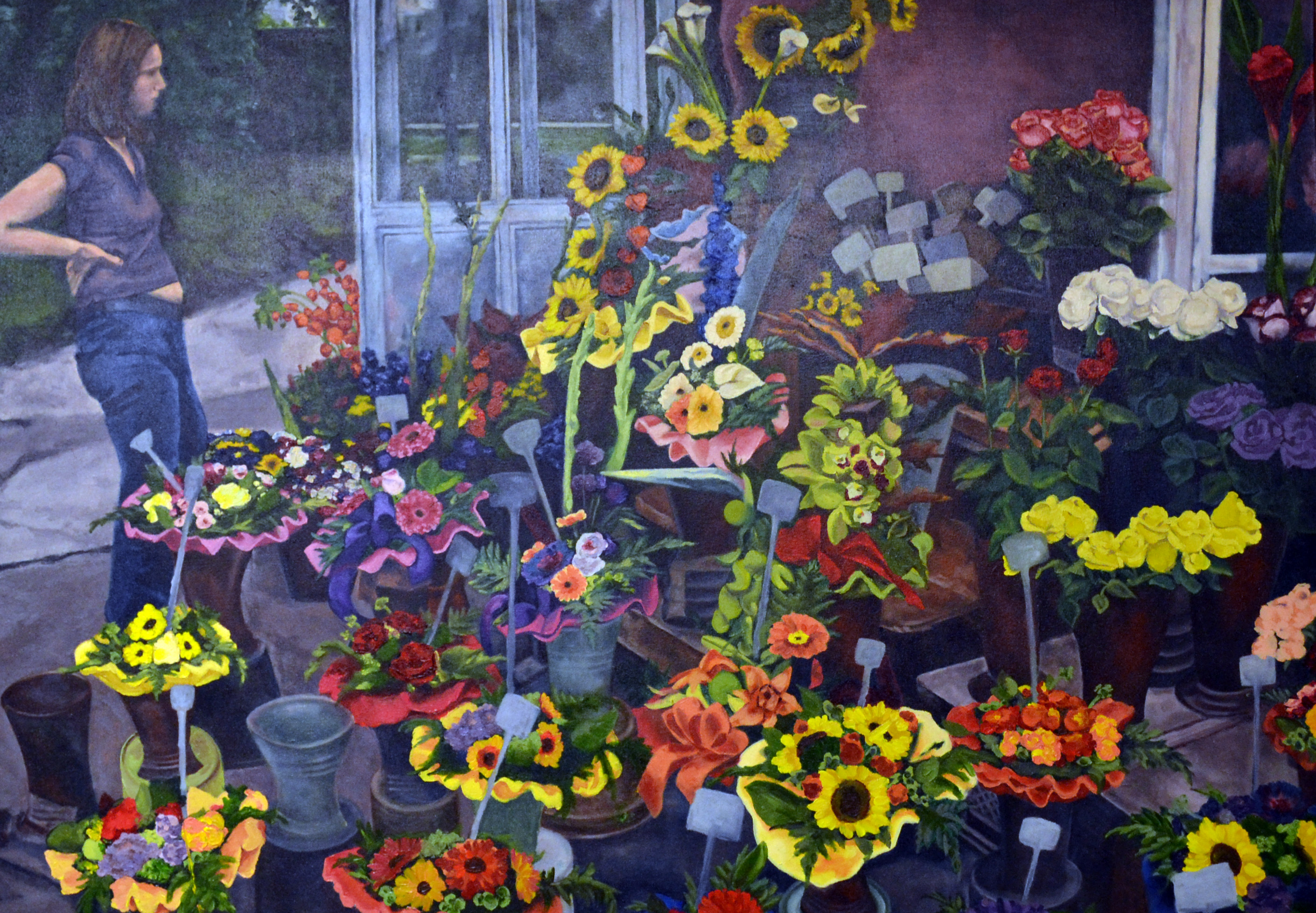 Ashley Marie Barrett‘s acrylic portrays rolling fields in a reddish hue, just below greenish forests and a hilltop. “Country,” an oil by Gail Simon Reynolds, blends lush colors, fences and a road that’s a minor element in the work.
