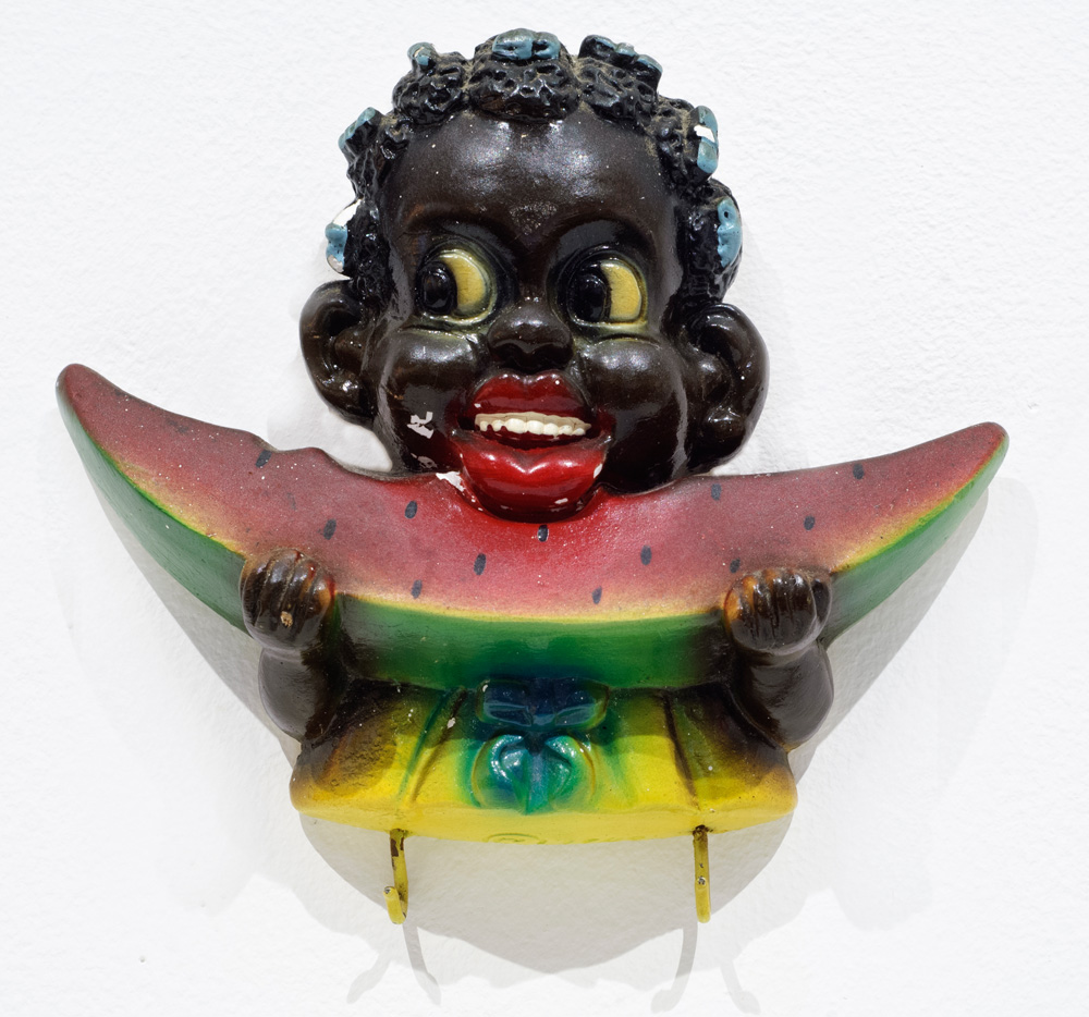 Blackout, selected from a collection that Berry began during the mid-1970s, includes well-known objects like an Aunt Jemima syrup dispenser from 1960 and more obscure items. It encompasses a postcard mocking an African American minister, a “Red Cap” picnic jug from the 1940s, and material regarding Coon Chicken Dinner. Three restaurants with that name operated in Utah and other Western states. Each of them had a stereotypical figure, representing African American men, at their entrance.