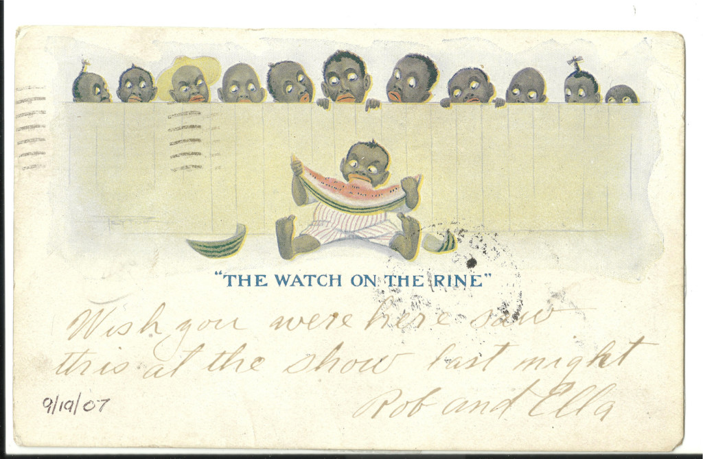 Indeed, the exhibit presents a range of artifacts: “Jolly Nigger Bank,” whose subject has outlandish lips and other distorted features; “Darkie,” a top-selling toothpaste in Asia until a name change in 1989; a ceramic ashtray from roughly a century ago based on an ideology perceiving anyone of African descent as subhuman. There’s also a postcard published just after 1900 that depicts an alligator chasing a young African American up a tree. That event is seen as humorous.