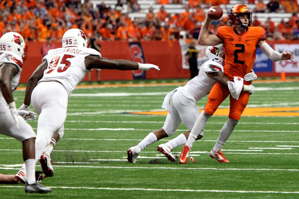 Through two games, that was probably a wise approach. In SU’s Sept. 2 opener, Babers’ up-tempo offense set several records as the Orange throttled outmanned Colgate 33-7 at the Carrier Dome. But in SU’s second game on Friday, Sept. 9, the roles were reversed as No. 13 Louisville rewrote the record book by thumping the not-ready-for-prime-time Orange 62-28 before a loud but surprisingly small crowd of 32,184 at the Dome.