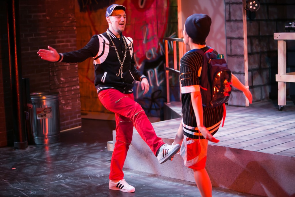 Two other players join in for The Bomb-itty of Errors, the rap musical version of The Comedy of Errors, Shakespeare’s silliest comedy. One is Donovan Stanfield, the only local performer on stage, as the disc jockey. This means he is removed from the action and sits upstage behind a counter holding a turntable. Stanfield is essentially playing himself, but in some of his few speeches he masters the jackhammer rap rhythm as well as the various sound effects that come from scratching an LP recording or turntabling.