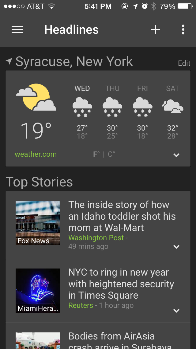 Screenshot of the Google News app depicting the local weather and top stories around the world. Screenshot by David Armelino | Syracuse New Times