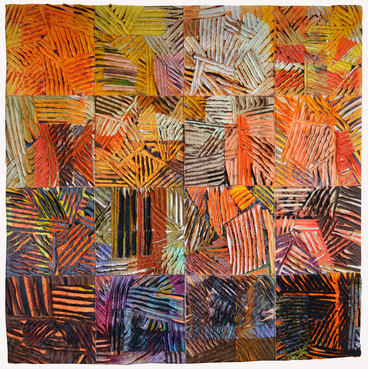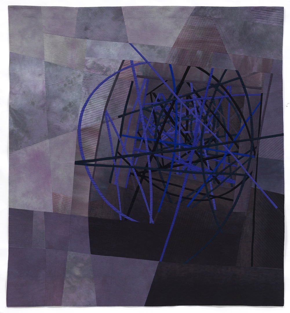 Julia Graziano demonstrates mastery of design and color in “Where Science and Humanity Meet II.” Striped patterns, flush with striking colors, seem to flow through the quilt.