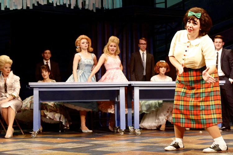 Tristen Buettel scores high as snotty, racist Amber, who is indeed the tops of the beautiful white girls. Austin Holmes’ dizzying dance steps as Seaweed, Maybelle’s son, shows the suburban kids how to do it and wins the heart of Penny (Lila Coogan); interracial romance turns her from a duckling to a swan. Troy Hussmann’s good-guy crooner Link is period-perfect. And recent graduate Kyle Anderson puts the right gleam on dance show host Corny Collins, who might be ultra-smarmy but is nobody’s fool.