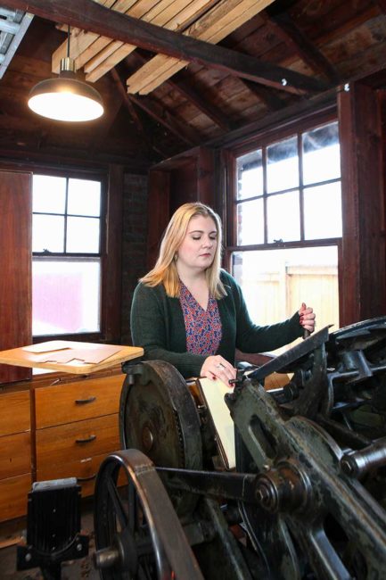 Mirra’s 1,200-pound Chandler & Price letterpress sits at her home, where she runs Forge from. (Michael Davis/Syracuse New Times)