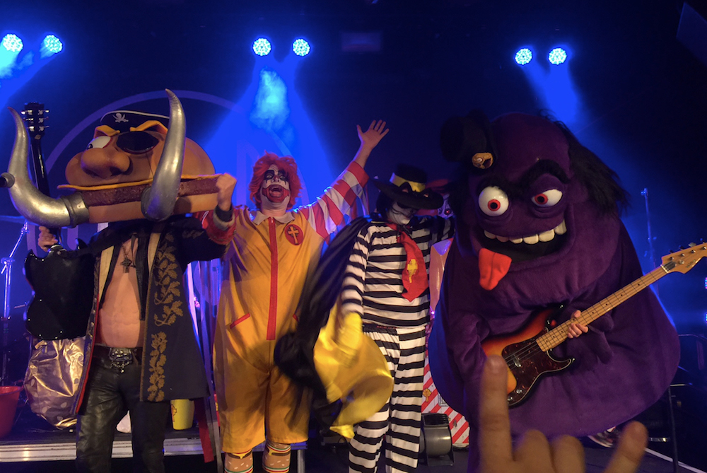 Odd also insists that weird as the show sounds, it needs to be seen to be understood. “When we walk into the club, it’s an eyebrows-up sort of situation,” he says. “It’s ‘Why this?’ and ‘Why that?’ But after they see it, it’s completely different. People fall in love with it. Just watching these characters up there playing songs is one thing. Then this crazy weird thing goes on in each song. Ronald pulls in the crowd, there’s audience interaction. There’s birthday party tricks, laser-eyed skull clowns on the stage and inflatable burgers bopping around the crowd. It’s a multimedia experience.”