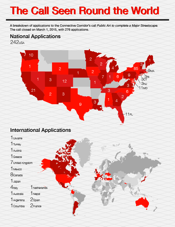 It’s a wrap. Our call for public art closed this week and it was a call seen round the world. The Connective Corridor, in partnership with the Syracuse University College of Visual and Performing Arts, received 276 applications from five continents, 17 countries, and 36 U.S. states. Of those, 85 are New York State-based, with more than 30 regional artists. Applications are very high quality, with an impressive portfolio of work by both established and emerging artists. The results are truly world-class.