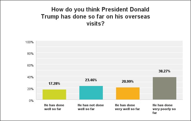 Here are the results of last week’s poll, which asked how you thought President Donald Trump had done so far on his overseas visits: