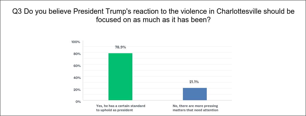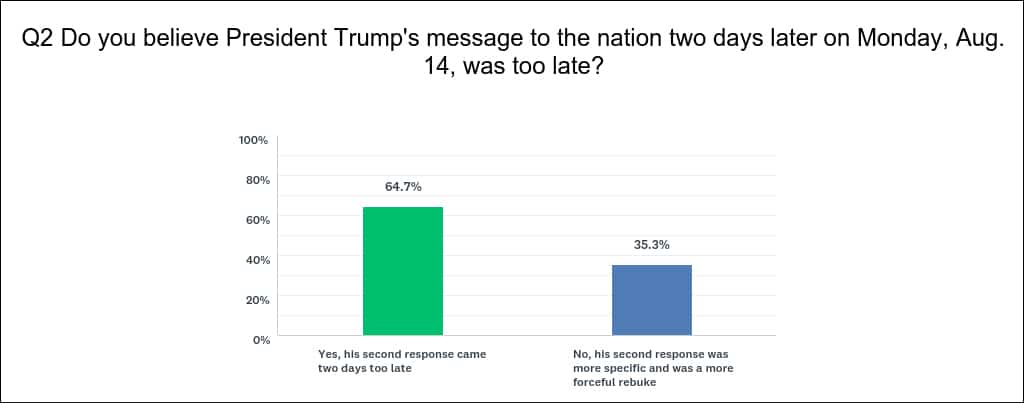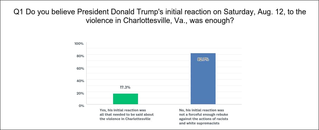 Here are the results from last week’s poll, which asked: Do you believe President Donald Trump’s initial reaction on Saturday, Aug. 12, to the violence in Charlottesville, Va., was enough?