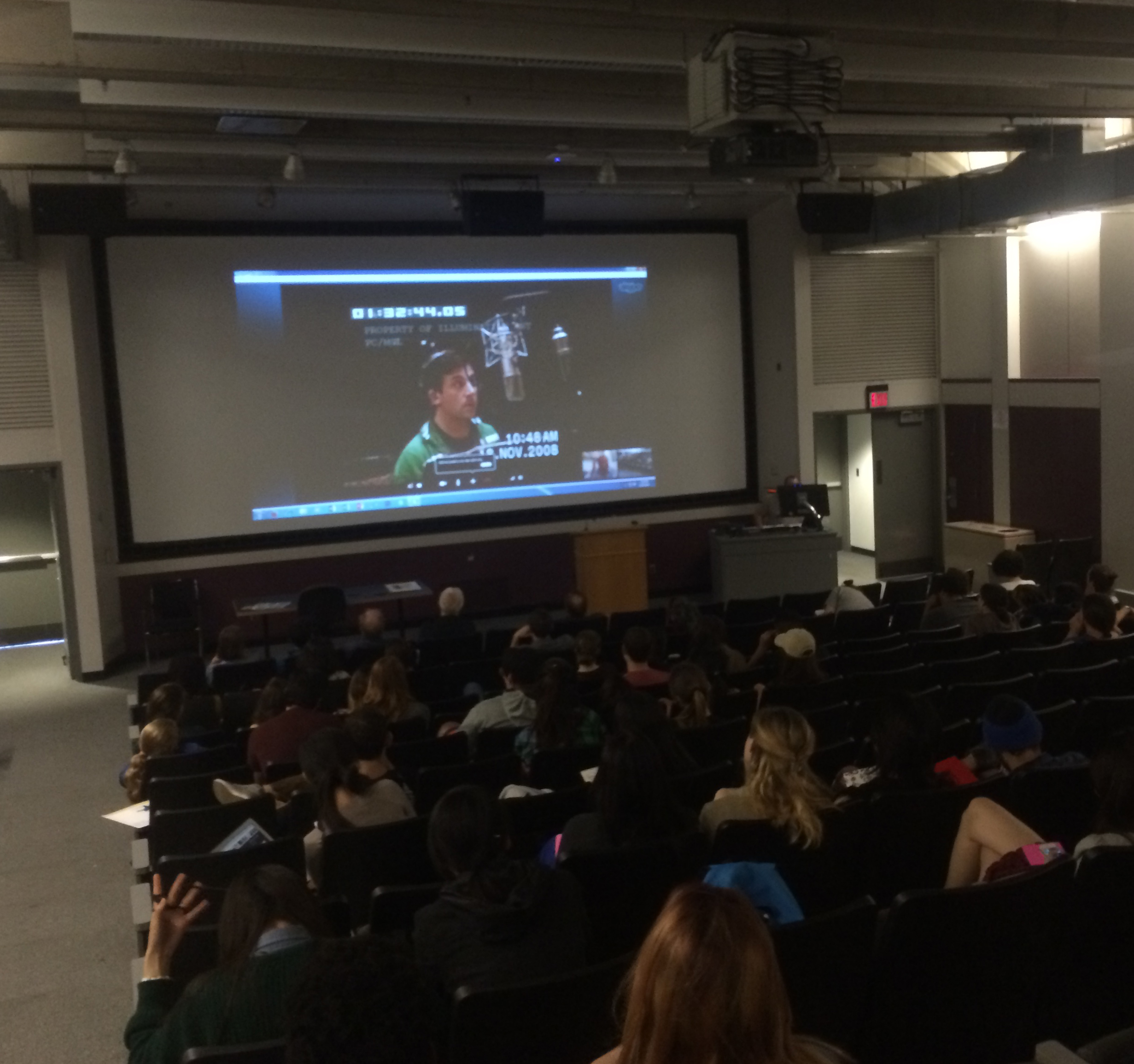 The room is dim. 70+ college students in jeans, hipster gear, and pajamas sit up in their seats and giggle, mesmerized by a giant, friendly Wizard of Oz-like head projected in front of them that walks them through a series of illustrations as if reading the children a storybook and acting out all the voices. One would expect a popcorn and candy stand nearby.