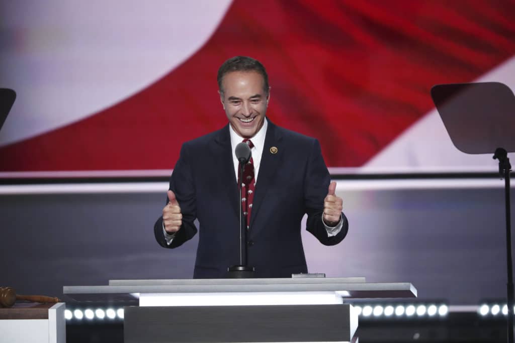 FILE-- Rep. Chris Collins (R-N.Y.) speaks during day two of the Republican National Convention, at the Quicken Loans Arena in Cleveland, July 19, 2016. Collins, who was one of President Donald Trump’s earliest and most vocal supporters, was charged with insider trading on Aug. 8, 2018. He was accused of tipping off his son and others to sell stock in an Australian pharmaceutical company before the results of one of its failed drug tests became public, federal prosecutors said. (Doug Mills/The New York Times)