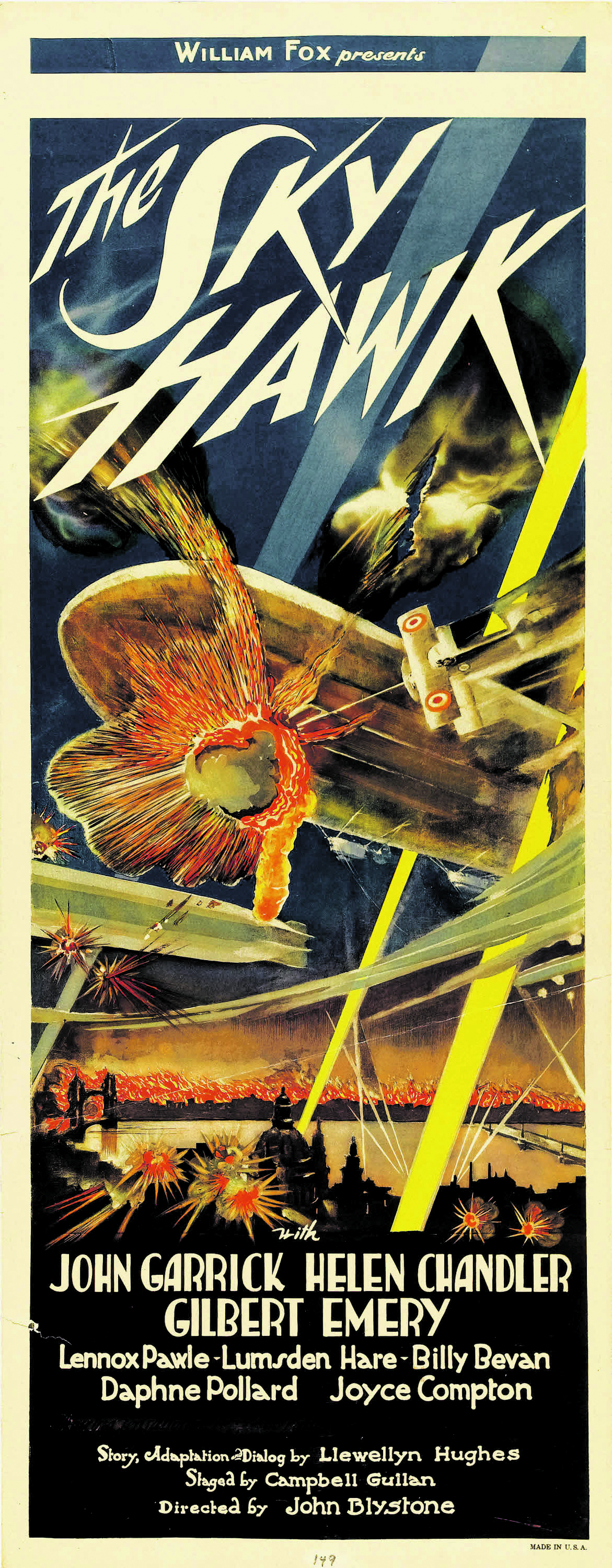 The afternoon shows commence with the silent comedy-drama What’s His Name (1 p.m.), Cinefest’s second Cecil B. DeMille feature, and only his third as a filmmaker. Max Figman plays the title role, a husband who is perfectly happy as a soda jerk until his wife (Lolita Robertson, Figman’s real-life spouse) gets bitten by the show-biz bug. Next is the 1930 Fox drama The Sky Hawk (2 p.m.), with Helen Chandler and John Garrick in a World War I adventure about aviators and zeppelin attacks.