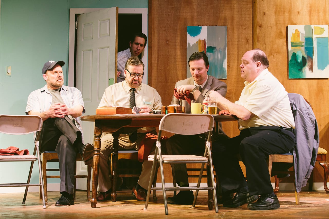 Director Heather J. Roach, a founding member of the company in both manifestations, pays more attention to the physical. The finished set, with 1960s-era lime green walls by Christopher J. Lupia, comes with five slammable doors. Not only are body set and movement as important as the delivery of Simon’s gag-filled lines, but the poker players can get up from the table, run around the room, and scamper under the table.