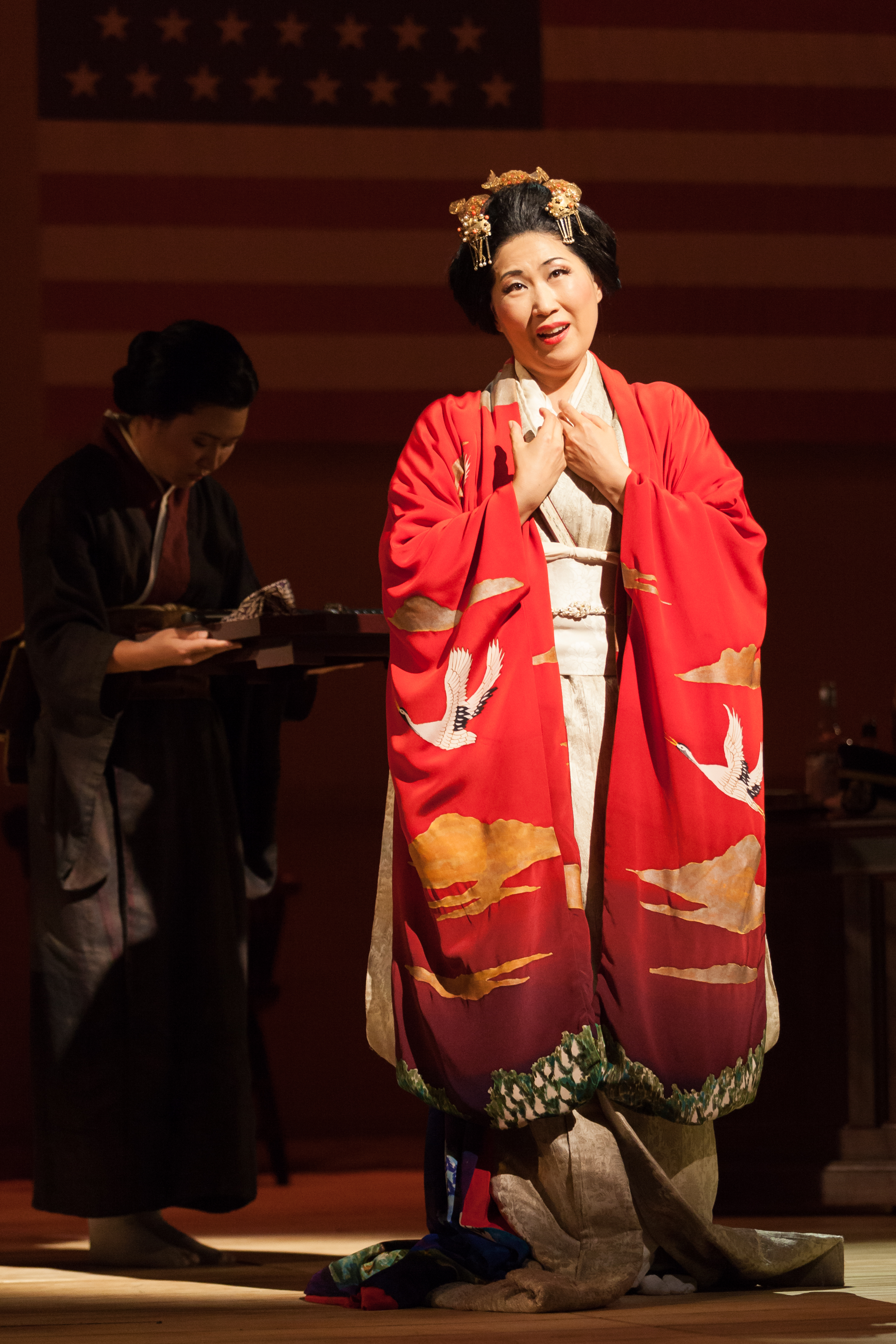 Zambello’s most striking innovation is to stage the opening scene in the American Consul’s office, crowded with tall, well-dressed western women carrying parasols. We should never forget that at the time of the dramatic action, the United States was an established industrial power while Japan was emerging from a self-imposed dark ages. Projected upstage are the words of the Pledge of Allegiance in bold Roman letters, seemingly benign but nationally assertive. They are above the apparently subservient Japanese inscription, which the Americans do not bother to read. Set designer Michael Yeargan’s contributions, perfectly lighted by Robert Wierzel, are not only gorgeous and arresting but rich in symbolism, almost a parallel dialogue with the audience. Impossible to ignore are two vertical, translucent panels, perhaps of rice paper, one representing Japan, the other the United States, which tumble down from time to time, obscuring what we try to see through them.