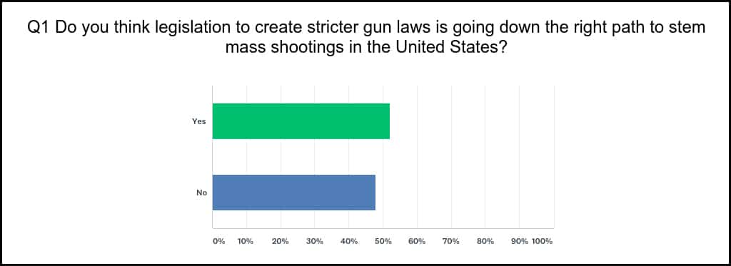 Here are the results from last week’s poll, which asked: Do you think legislation to create stricter gun laws is going down the right path to stem mass shootings in the United States?