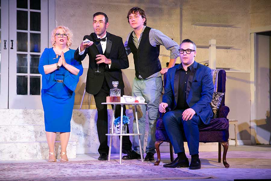 Show-biz snark: From left, Heather Jensen, Abel Searor, Isaac Betters, and Donnie Williams in Central New York Playhouse’s It’s Only a Play. (Amelia Beamish photo)