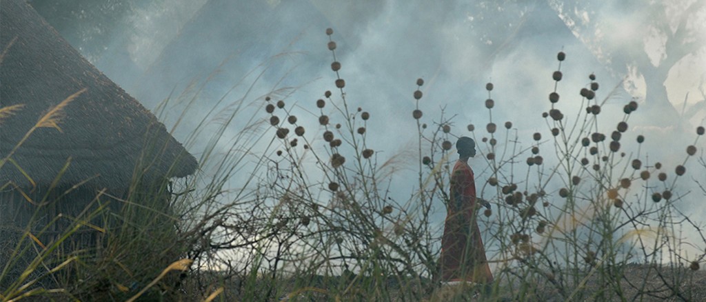 A relatively straightforward photograph portrays a woman dipping a bucket into a pond to gather water for tobacco plants. In a more interpretive vein, Gabel’s shot of a woman walking down a trail toward a medical clinic also integrates vegetation, a nearby forest, and huts partially obscured by morning mist.