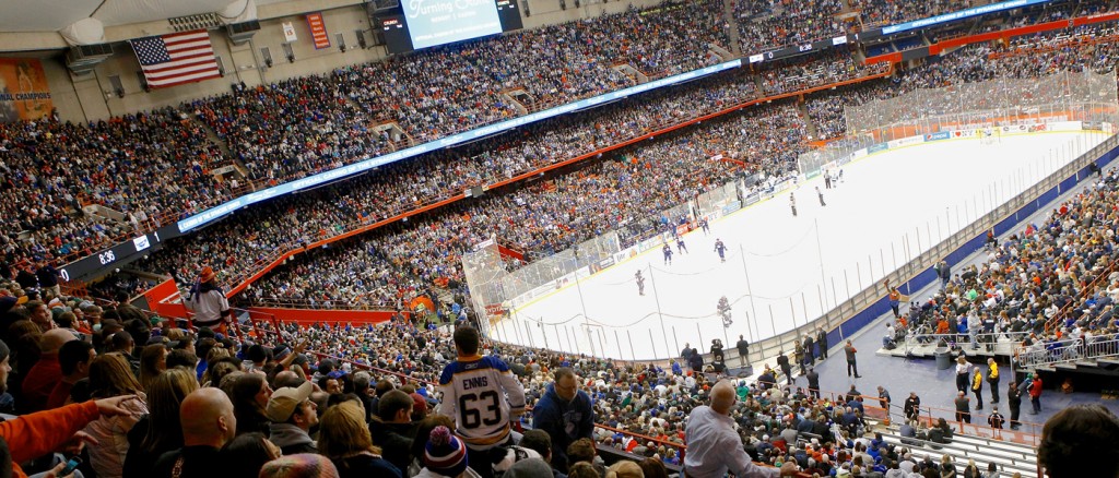 Dome fans are used to long-distance viewing, and the fans throughout the Dome Saturday seemed to enjoy the spectacle, from the pre-game introductions of former SU greats Joe Morris and Derrick Coleman to the human “wave” late in the game. About the only dud of the night was a lame stunt by Steve-O of MTV’s “Jackass” fame, but that’s a footnote on a night when hockey hit the big time in Syracuse.