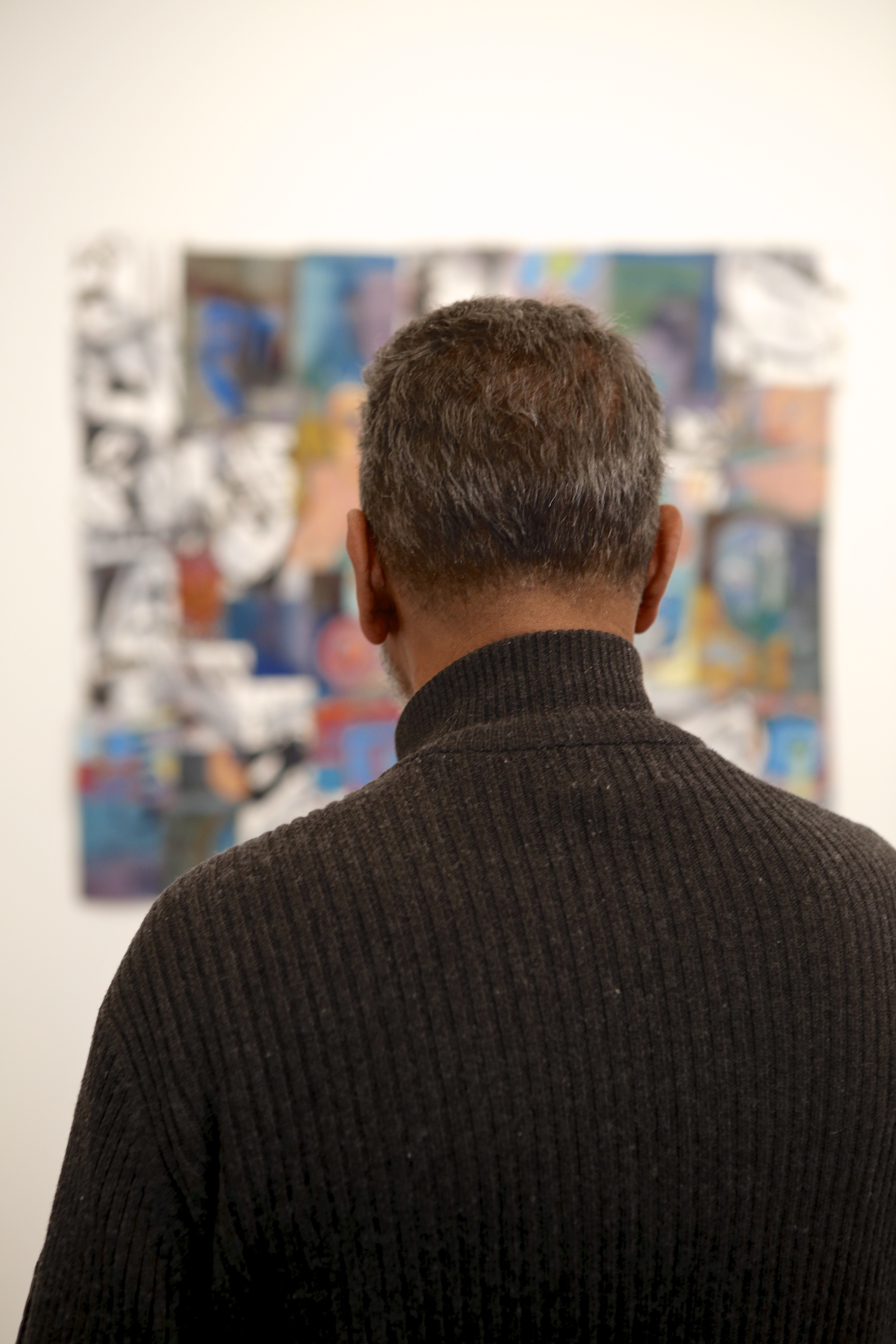 The exhibition features four large pieces, 15 smaller works, and four sculptures, all of which have their genesis in the artist’s own artworks. In creating one of the larger works, he cut out segments from four paintings, set them on a long table, and began improvising. He reassembled the pieces, viewing them close-up and from the vantage point of a ladder. He considered various combinations, striving for harmony and balance. Typically he looked at a final version multiple times.