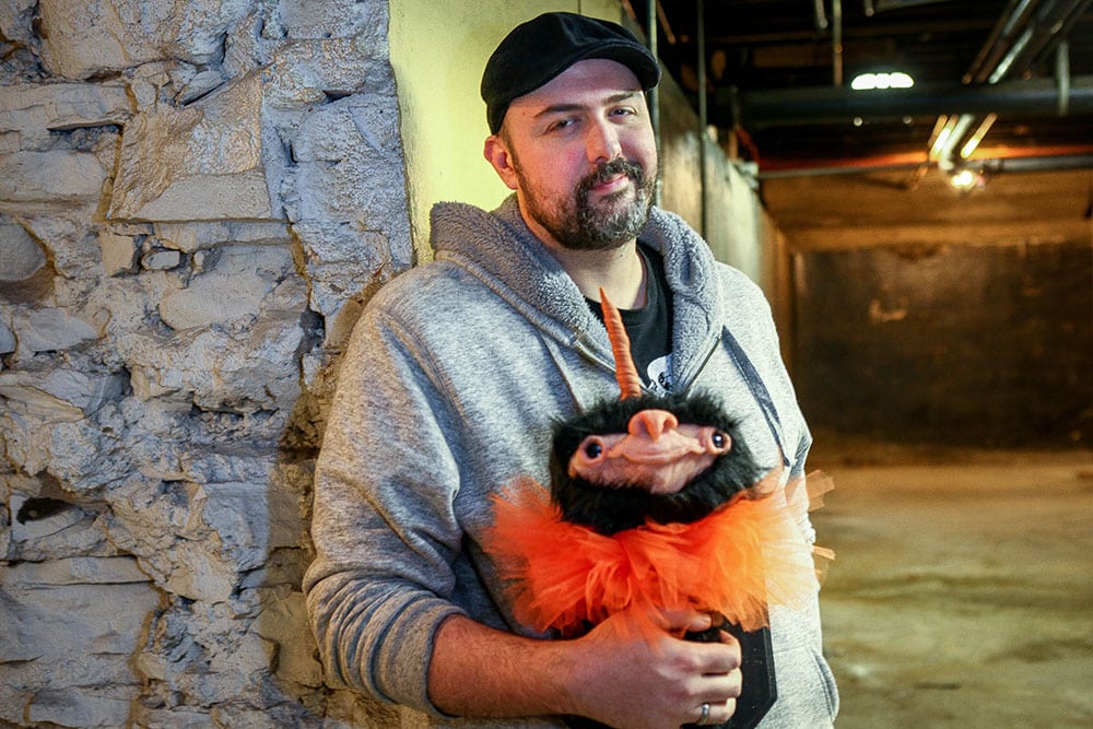 Isaac Bidwell with one of his creations: “If I’m drawing something and I laugh at it, I know it’s going to work.” (Michael Davis/Syracuse New Times)