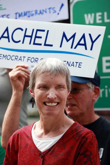 Several attendees in support of Cynthia Nixon also held signs for Rachel May, a candidate for New York state Senate. (Michael Davis/Syracuse New Times)