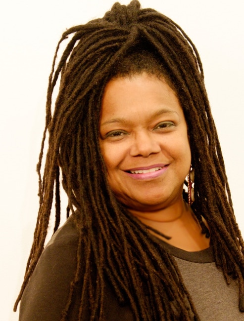 “Octavia Butler: As We Become The Other” commemorates a science fiction writer and documents yet another creative direction. It’s a full-length piece with lots happening in its bottom half. Five streams of fabric, all in gaudy color, stretch to the floor.