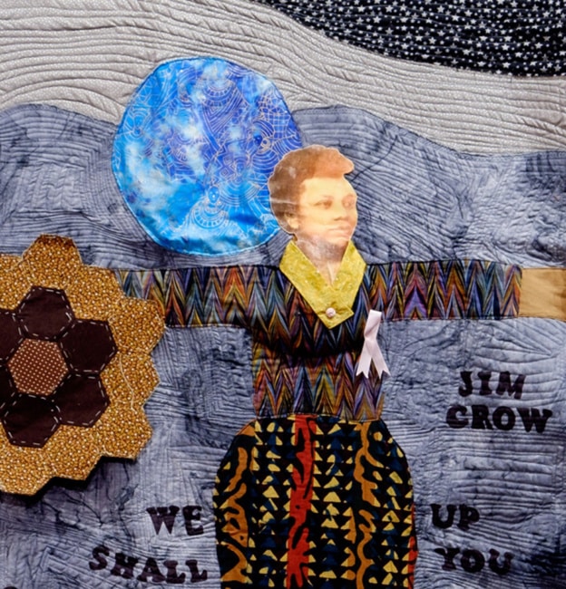 The artist also creates several Warrior Woman quilts, dedicated to individuals such as Ida B. Wells, a crusading, influential journalist and a major figure in the anti-lynching movement roughly a century ago. There are images of Wells herself and a woman murdered by a lynch mob, and cloth representing a wedding dress. Wells postponed her wedding several times because of a commitment to her activism.