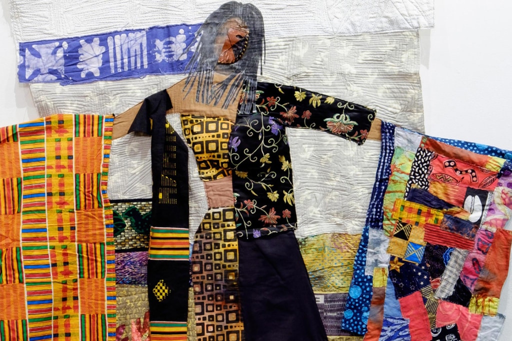 The exhibit’s quilts merge multiple materials: kente clothing popular in West Africa, found objects, richly colored patterns and white cloth, fabric imprinted with photo images, pouches filled with soil gathered in Ghana, Syracuse and other sites.