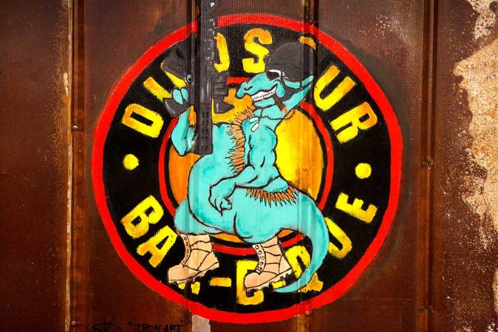 In 1984 they changed the name to Dinosaur Concessions and started working state fairs and regional festivals, still serving three basic sandwiches — Italian sausage and peppers, hamburgers and sliced steak — and occasionally chicken. The following year, Dino moved to Arizona while Stage and Rotella perfected their own original slathering sauce, which they dubbed the “Mutha Sauce.” So they changed the business name again, this time to Dinosaur Bar-B-Que.