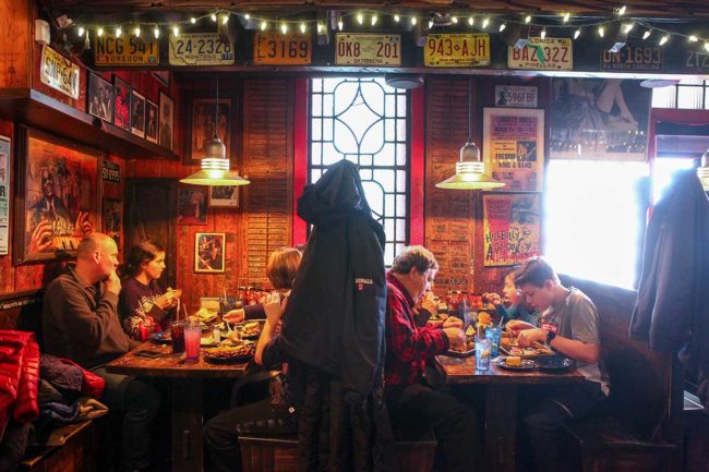 Stage’s culinary conversion to “true-blue barbecue” would pay off plenty in the long run, but it didn’t happen overnight. He and Rotella — who has since retired to Florida — opened the place on Oct. 11, 1988, as the single-room, cafeteria-style Dinosaur Bar-B-Que Express. The partners kept dreaming the dream even though business remained excruciatingly slow until 1990 when the Luckwaldts joined up to open the second room, the barroom. Stage and Rotella tore out the old N&H bar and installed one that had previously done business at Farone’s restaurant on the North Side. The first house beer was Ape Hanger Ale by Middle Ages Brewing, and the first dinner special was Not Your Mama’s Meatloaf.