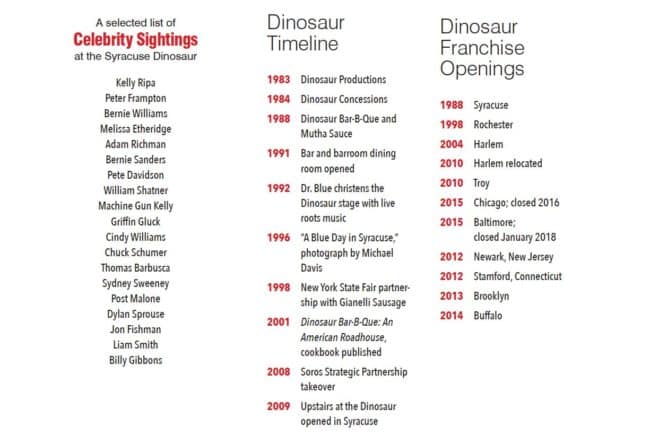 Perhaps prompted by corporate ambition, more than a half-dozen new Dinosaur locations opened between 2010 and 2015. Two of those seven new sites — restaurants in Chicago and Baltimore — shut down within a few years. “It was too much too soon,” Stage says.