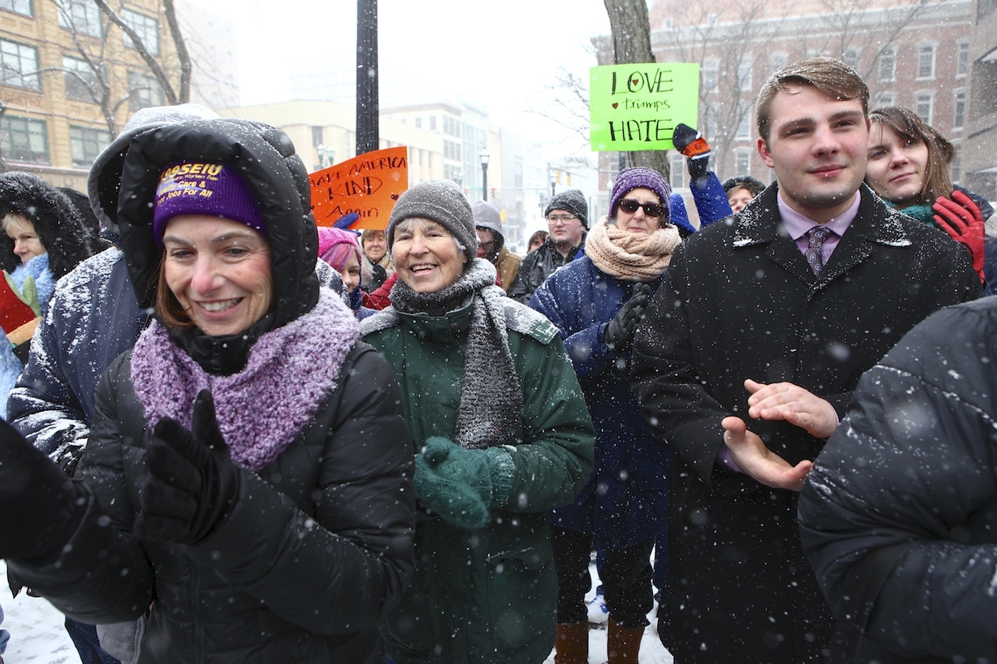 Also unusual is the high-profile participation of Miner, Syracuse’s mayor. In addition to hosting Trump Tuesday (Jan. 31’s focused on local residents who would be affected by the loss of the Affordable Care Act), she spoke at the airport protest and delivered a well-received speech in Seneca Falls Jan. 21.