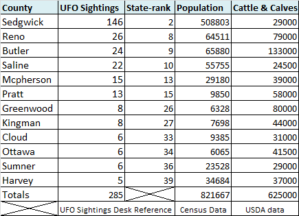 In terms of sighting vs. population, Kansas overall had 2,622 people per UFO sighting. The 12 cluster counties had a ratio of 2,983 persons per UFO sighting.